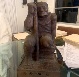 Many of Janel’s works were sold as “folk,” “outsider,” or “self-taught naïve” art. I notice his human figured sculptures sold in both California and Swedish auction houses in the 2020, as he’s been rediscovered today. Closely resembling my “lame” man, Janel’s “Bodybuilder” is equally imposing, and sold at Toomey Auctions estimated at $1k-2k. An old gentleman perched on a toilet at five inches tall sold for $1,747 in Stockholm Anktionsverk, a dapper but ugly “Gentleman with Walking Stick” sold for $5,250. A carving created in 1922 called “Skalvridning” (twisting the bowl) at eight inches high, showing two-figures holding a massive bowl, sold at Stockholm’s most famous auction venue, Bukowski’s for $8,400.