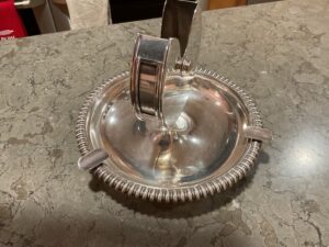 Silverplated objects don’t hold much value unless you it’s Shefield silver, a process done previous, before 1850, to electroplated silver. I love Sheffield plate because you see the copper metal underneath the silverplating. It gives off a warm glow. It’s called Sheffield because it hailed from Sheffield and grew to Birmingham. Post 1840s silverplate will bear the initials EPNS or EPBM for electroplated plated nickel silver or electroplated Brittania metal silver.