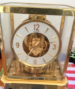 I love this Gold and Crystal Atmos nine-inch mantel clock with its modern case. HK’s grandfather received it as a gift like many VIPs in the mid-20th century. Many boxed Atmos clocks were presented since the 1940s. Not the least of the ‘givers’ is and was The Atmos Mantle Clock became the go-to gift for the Swiss government to give visiting dignitaries since the 1950s.