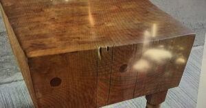 Known for its rugged durability, butcher shops and hog famers clamored to buy four-hundred pounds of maple stacked block on block, bolted together on four legs. Those bolts needed tension adjustments for the climate. Pork production became nationalized after 1920 and the neighborhood butcher became obsolete. The boards made of seven-by-four maple stock sixteen inches long, two inches wide, with the ends stacked as end grain, glued together edge to edge. The end grain was easy on knives and remarkably self-healing when cut, as the wood fibers closed up. Some modern, paltry, five inches thick butcher block counter tops are edge grain. The cutting edge offers high moisture resistance.