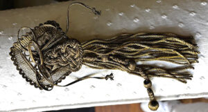 The tradition of braided metal broches, metallic mesh thread woven on a support of silk threading, dates to French and Spanish military (regimental) jackets of the 18th century. I found such an embellished braid in the collection of the MET Costume Institute, as a textile trim. The MET also owns an example in their collection of a metal tassel watch fob, made of 10K gold thread, which, like our example, is blackened with oxidation. By the late 19th century “tassel” brooches became popular made of gold, rolled or plated gold and lesser valued wirework in imitation of the metallic thread brooches worn in the previous years, by both women and men as a military flourish. When 10K or 14K gold tassel brooches added black enameling, these were worn as mourning brooches, especially as made popular in England after the death of Prince Albert (1861).