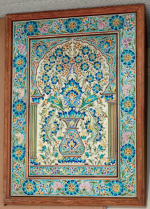 FF’s tile is a wonderful artifact made in the 1980s by the Algeria master craftsman Mahamed Boumehdi. His forbearers then his progeny carried on the tradition of Middle Eastern design in ceramic tile. Queen Elizabeth II received a gift from President Bendjedid of almost this exact work of art on her visit to Algeria in 1980. That tile lives in the Royal Collections Trust, where the facsimile of FF’s tile resides. If FF looks close at the bottom of his tile he may find the artist’s signature in Arabic. Look for that!