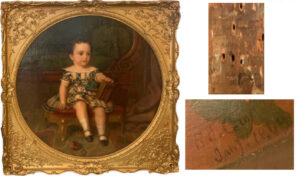 The owner of this little “Biddy-boy” portrait wants to know the artist, and if the artist sells for much. SC also wonders about the importance of this Americana artist. That’s not really the focal point of this little work, not all well painted. I found the signature almost indecipherable. It looks like A. R. Cu… or R.A. Cl… However, the artist of such a work, in this case, isn’t as important as the quality and style of child’s portraiture.