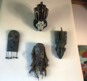 KMcD sent me a photo of four African masks purchased in Tanzania and Kenya, originally from Zaire, the Congo. I love these masks because I spent two years in upper Nigeria and the Ivory Coast with the VSO, the British version of the Peace Corps. I treasure my mask from the Ivory Coast, a wisdom mask, worn by young men at puberty rites. The mask shows a female spirit on the forehead in the shape of a bird that faces downward to the bridge of the nose. Since I raised a male I relate to this mask, acquired in my early twenties, before I became a mother.