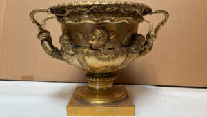 Examples of objects from antiquity featuring Dionysius/Bacchus were found in India, Serbia, Greece, and Italy. The god is represented in many forms, none more famous that the Warwick Vase. PP’s bronze is a late 19th century copy, not in marble, like the original. But cast in bronze with gold overlay gilding. Sotheby’s sold one very similar for $2,700 in November 2012. Since this is an older comparable sale, I estimate the value of the bronze at $3,000 today.