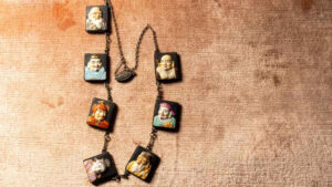 JE owns a wonderful 1900s vintage Japanese necklace composed of faces of benevolent gods. The links are porcelain on sterling.
