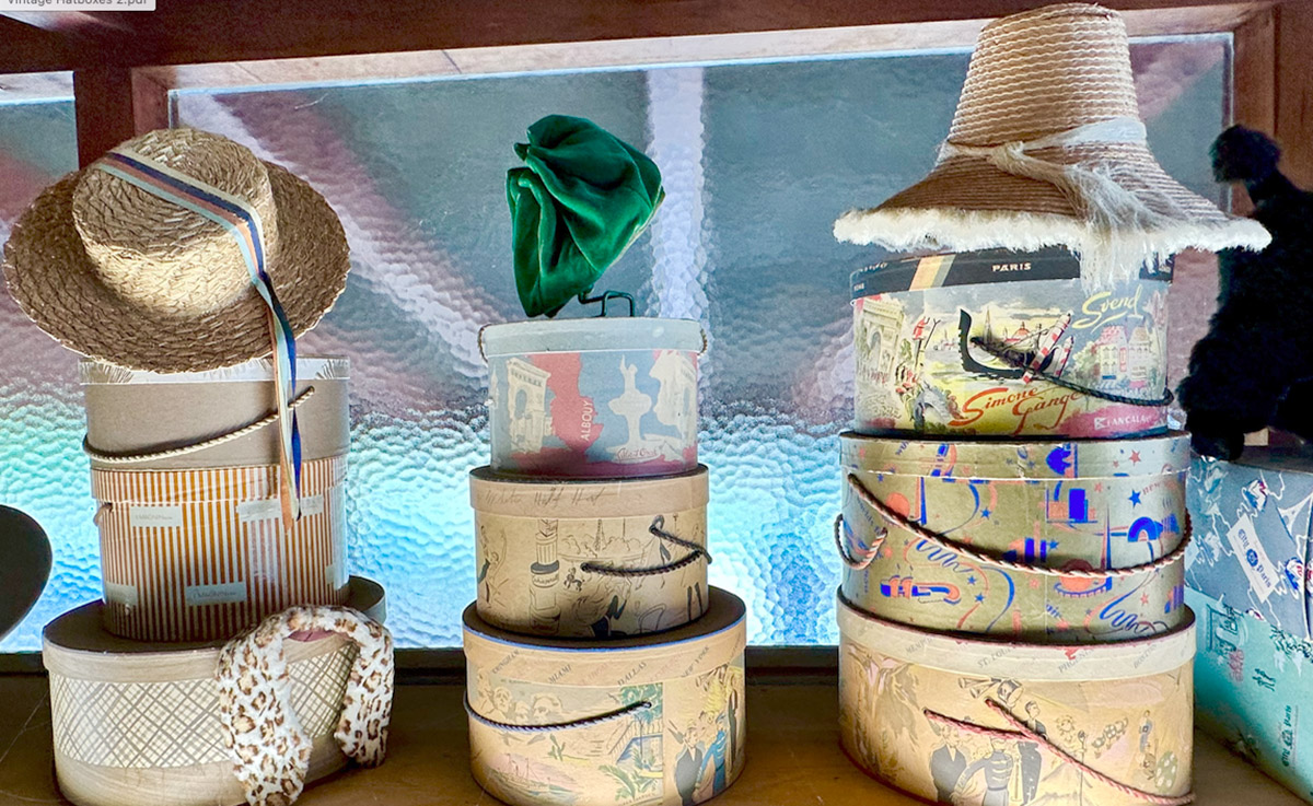 Reader LM ALSO owns a Doree box, along with a desirable collection of other vintage hatboxes. Her Doree box, $48 at Etsy, is one of her favorites. In an era where lady’s accessories came advertised in pastels, the Doree box is arrestingly red, black and white. Other names to watch for are boxes from Leslie James, Don Anderson, and Claude St Cyr. LM owns elegant hatboxes, found at garage sales, thrift and estate sales, with whimsical themes from a more innocent era. Classic Paris scenes feature fashionable shoppers of bohemian Paris, and mustachioed gendarmes.